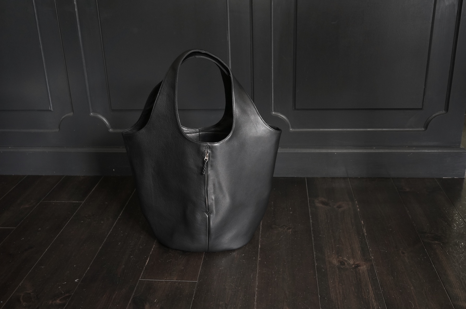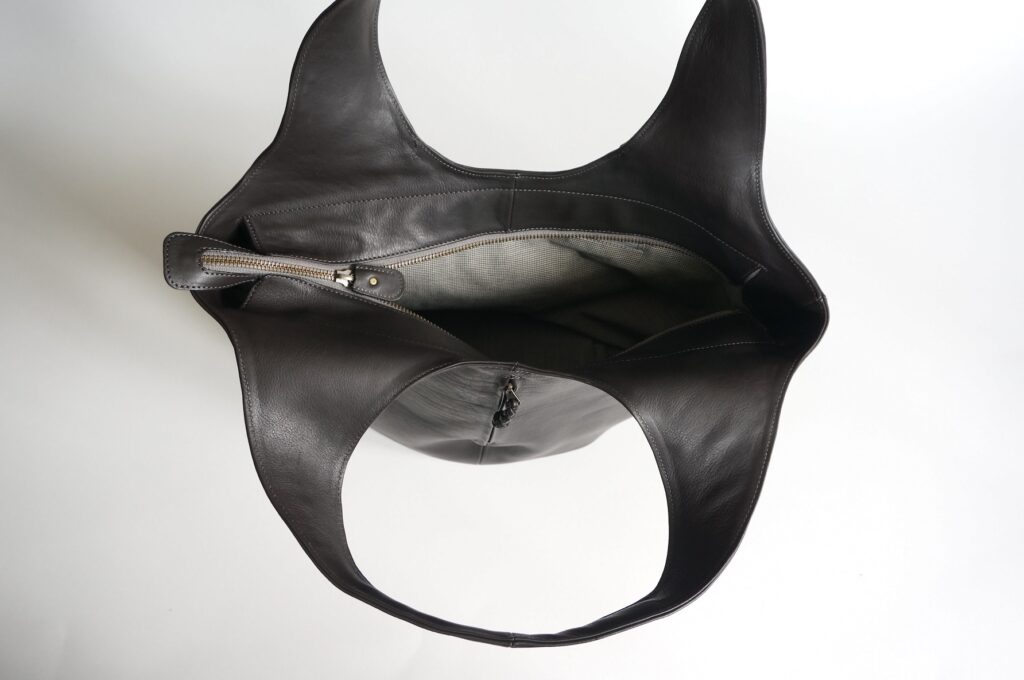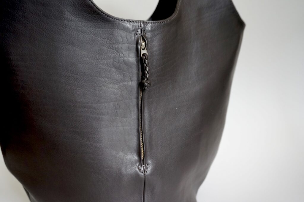 縦に配したファスナーポケットと出し入れしやすいオープンポケットが特徴の大きめトートバッグ。A4サイズの書類や立体的な荷物までしっかり収納できます。内側にも複数のポケットを備えているので整理整頓も快適。シンプルなデザインに実用性を詰め込んだつくりは、日常使いから通勤まで幅広く活躍します。使い込むほどに革が柔らかく馴染み、深みのある風合いへと育っていくのも大きな魅力です。