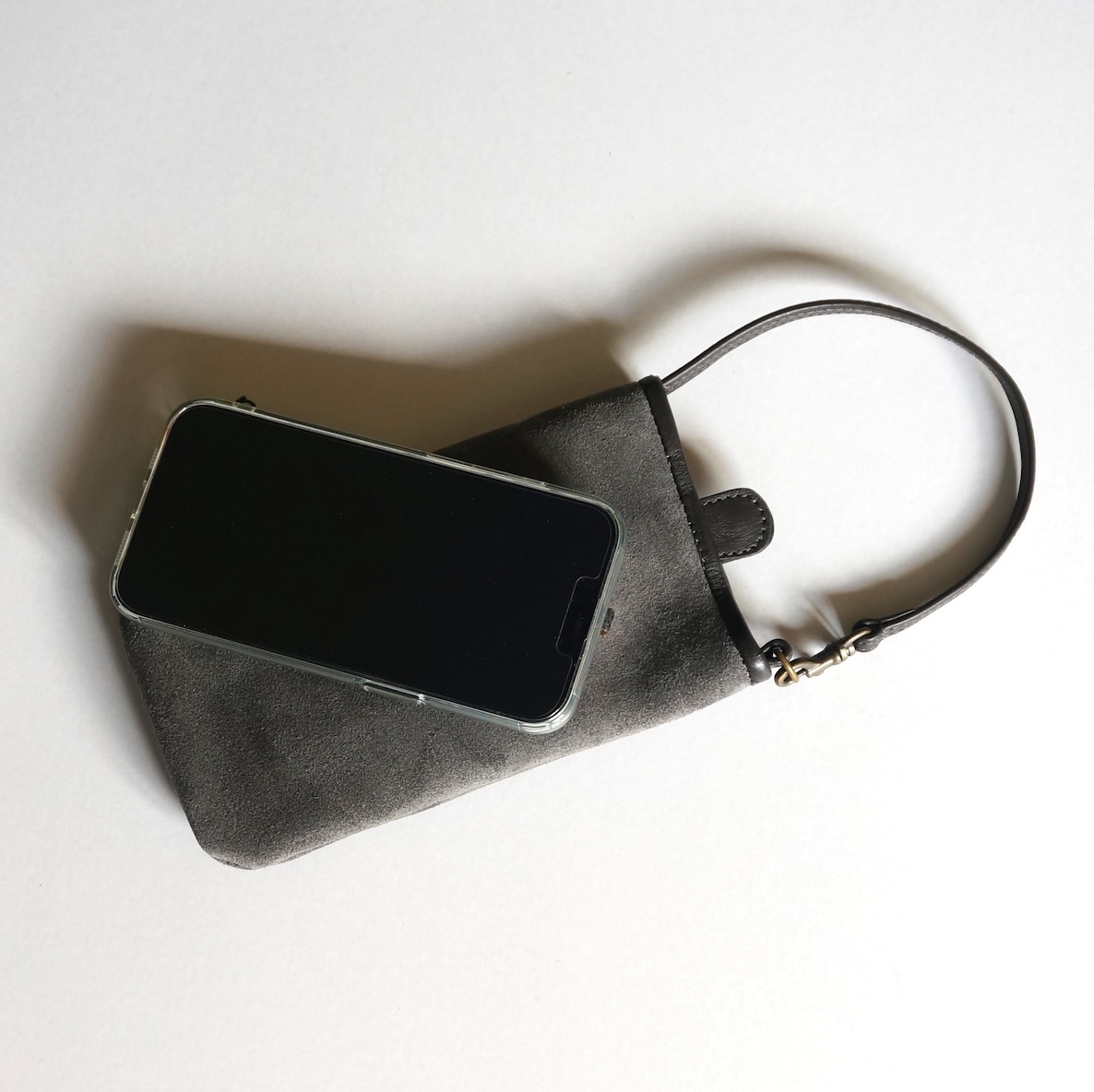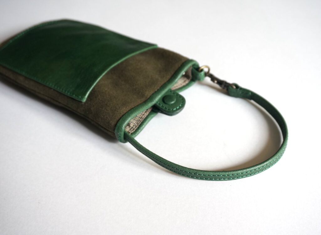 Smartphone case / Material: 牛革 size: w 10.5 × h 18cm price: ¥6,600 前側には、メガネやペンなど入れられるポケット付き。